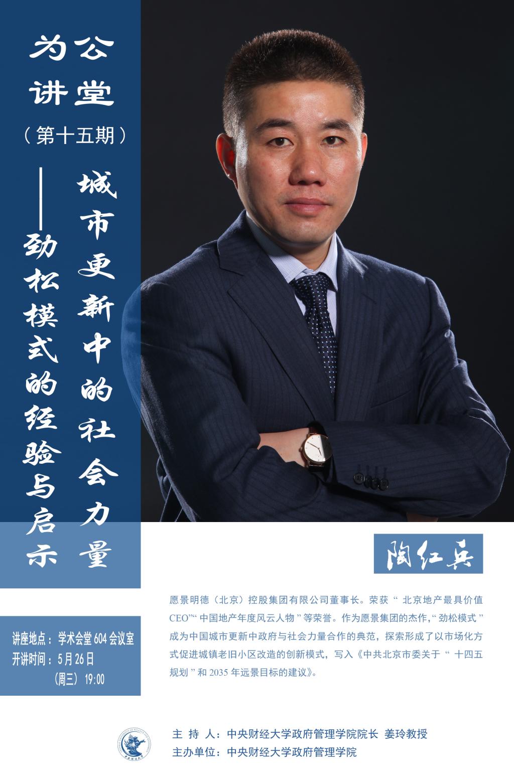 嘉宾简介:陶红兵,愿景明德(北京)控股集团有限公司董事长。荣获“北京地产最具价值CEO”“中国地产年度风云人物”等荣誉。作为愿景集团的杰作,“劲松模式”成为中国城市更新中政府与社会力量合作的典范,探索形成了以市场化方式促进城镇老旧小区改造的创新模式,写入《中共北京市委关于“十四五”规划和2035年远景目标的建议》。