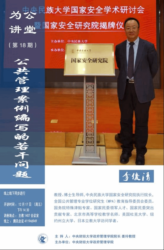 嘉宾简介:李俊清,教授、博士生导师,中央民族大学国家安全研究院执行院长,全国公共管理专业学位研究生(MPA)教育指导委员会委员。国务院特殊津贴专家、国家民委领军人才、国家民委突出贡献专家、北京市高等学校教学名师。美国杜克大学、纽约州立大学、日本立教大学访问学者。