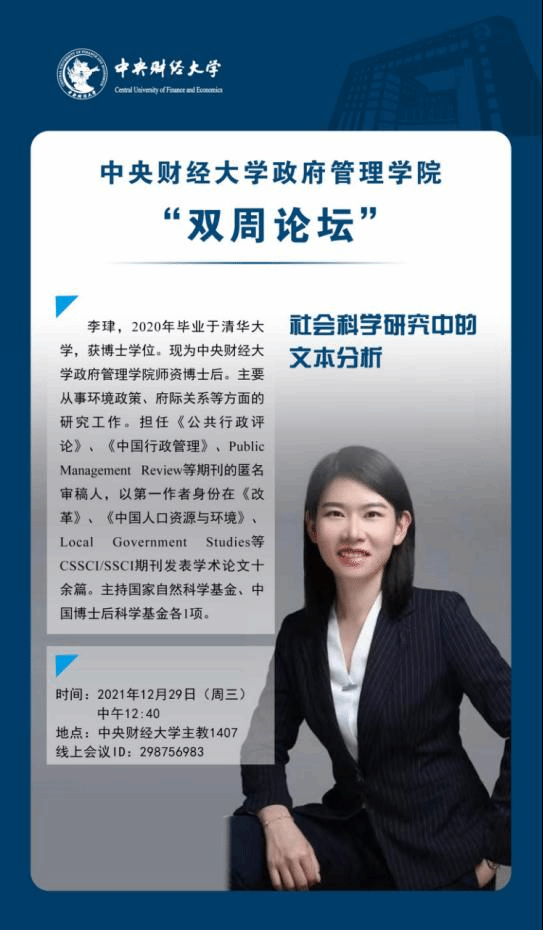 李珒,2020年毕业于清华大学,获博士学位。现为beat365vip官网登录入口师资博士后。主要从事环境政策、府际关系等方面的研究工作。担任《公共行政评论》、《中国行政管理》、Public Management Review等期刊的匿名审稿人,以第一作者身份在《改革》、《中国人口资源与环境》、Local Government Studies等CSSCI/SSCI期刊发表学术论文十余篇。主持国家自然科学基金、中国博士后科学基金各1项。
