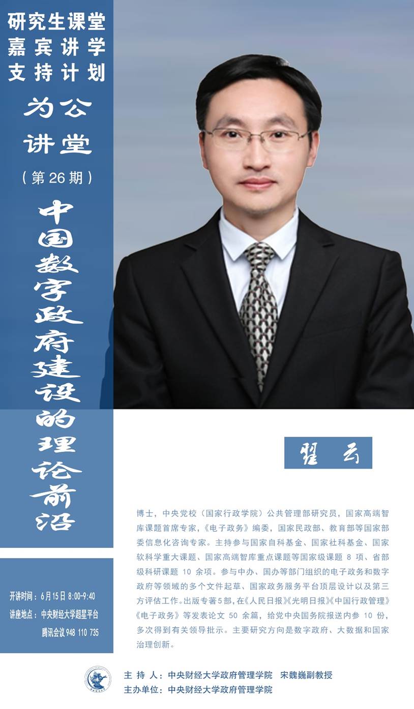 嘉宾简介:翟云,博士,中央党校(国家行政学院)公共管理部研究员,国家高端智库课题首席专家,《电子政务》编委,民政部、教育部等国家部委信息化咨询专家。主持参与国家自科基金、国家社科基金、国家软科学重大课题、国家高端智库重点课题等国家级课题8项、省部级科研课题10余项。参与中办、国办等部门组织的电子政务和数字政府等领域的多个文件起草、国家政务服务平台顶层设计以及第三方评估工作。出版专著5部,在《人民日报》《光明日报》《中国行政管理》《电子政务》等发表论文50余篇,给党中央、国务院报送内参10份,多次得到有关领导批示。主要研究方向是数字政府、大数据和国家治理创新。