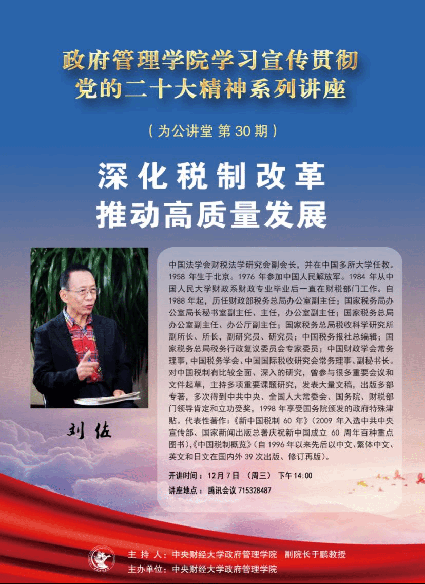 嘉宾简介:刘佐,中国法学会财税法学研究会副会长,并在中国多所大学任教。1958年生于北京。1976年参加中国人民解放军。1984年从中国人民大学财政系财政专业毕业后一直在财税部门工作。自1988年起,历任财政部税务总局办公室副主任;国家税务局办公室局长秘书室副主任、主任,办公室副主任;国家税务总局办公室副主任、办公厅副主任;国家税务总局税收科学研究所副所长、所长,副研究员、研究员;中国税务报社总编辑;国家税务总局税务行政复议委员会专家委员;中国财政学会常务理事,中国税务学会、中国国际税收研究会常务理事、副秘书长。