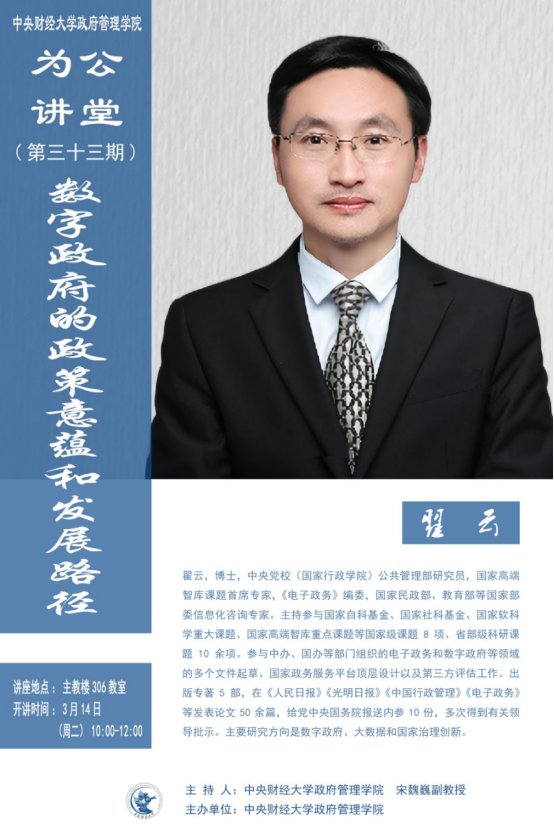 嘉宾简介:翟云,博士,中央党校(国家行政学院)公共管理部研究员,国家高端智库课题首席专家,《电子政务》编委,国家民政部、教育部等国家部委信息化咨询专家。主持参与国家自科基金、国家社科基金、国家软科学重大课题、国家高端智库重点课题等国家级课题8项、省部级科研课题10余项。参与中办、国办等部门组织的电子政务和数字政府等领域的多个文件起草、国家政务服务平台顶层设计以及第三方评估工作。出版专著5部,在《人民日报》《光明日报》《中国行政管理》《电子政务》等发表论文50余篇,给党中央国务院报送内参10份,多次得到有关领导批示。主要研究方向是数字政府、大数据和国家治理创新。