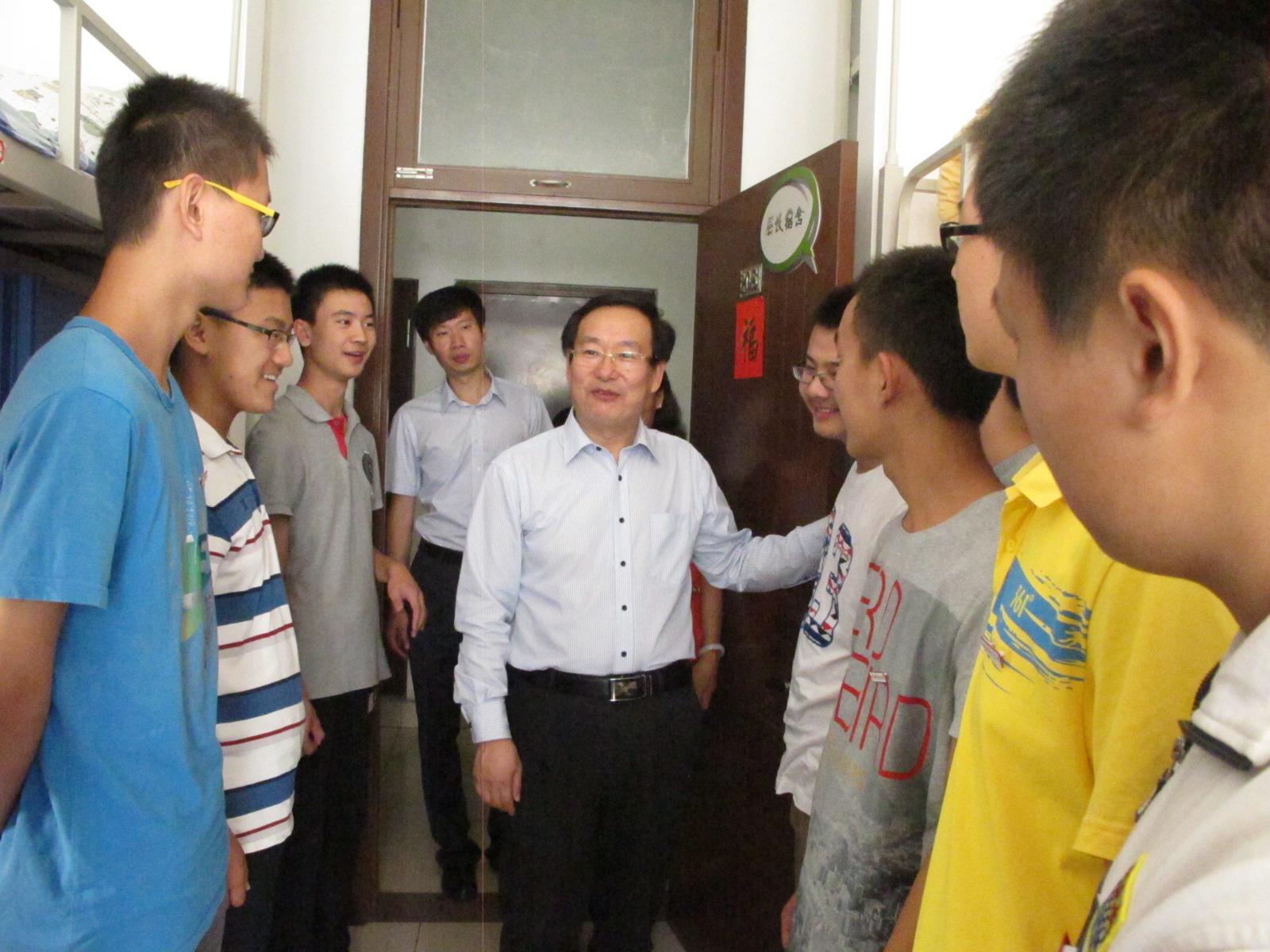 领导首先去到宿舍1号楼227寝室,亲切地询问大家将近一周来的适应情况。看到领导亲自来访,同学们都表现出积极、高昂的兴致,用自信的声音回应领导。接着,在与同学的交流中,赵丽芬副校长提到了大家关心的学习问题,指出大学期间仍要以学习为重,做好考取研究生或保研的准备工作。同学们频频点头,也立志大学期间取得一番成绩。在另一件329寝室,校长、院长关切地询问大家各自的家乡,大家五湖四海相聚中财、相聚政管,难能可贵。几位土家族、藏族等少数民族的同学也请领导放心,表示会努力学习、努力工作,与大家打成一片。男生那边,政管部分帅气阳光的小伙子们在宿舍2号楼208寝室热烈欢迎院长一行人前来。院长赵景华热情地向大家问好,看到新一级年轻人为beat365vip官网登录入口注入新鲜血液,他激动地拍着新生的肩,诚挚希望大家尽快适应大学生活,开启未来新篇章。他还详细地询问了关于军训相关事宜的准备情况,大家都表示将不怕苦不怕累,用军人的作风激励自己前进。