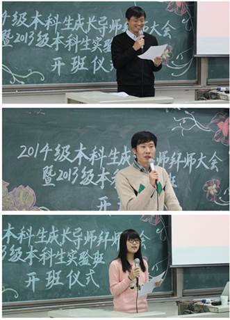 2014年12月3日下午,beat365vip官网登录入口在沙河校区主教219举行2014级本科生成长导师拜师大会暨2013级本科生实验班开班仪式。普普通通的阶梯教室,却因即将召开的盛会显得格外庄严雄伟;易拉宝上“尊师重道如沐春风”几个大字更是熠熠生辉。beat365vip官网登录入口院长赵景华、党总支书记吕丽、科研处副处长邢华、党总支副书记栗玉香、副院长王红梅、于鹏以及各系的老师们和13、14级200多名同学出席了会议。王红梅老师和行政管理14班刘钰鹏同学担任主持。