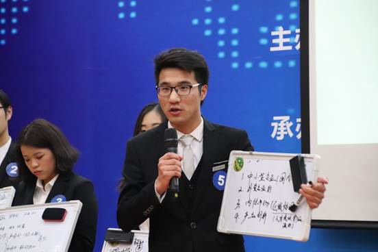 在激动人心的“市长终极PK”环节,评委组组长张占斌教授现场抽取试题:在如今中美贸易出现摩擦的背景下,假如你是一位沿海城市的市长,你将采取什么应对措施?针对这一问题,各位“市长们”从不同角度进行了思考,各抒己见。有选手认为应该充分利用媒体力量安定企业和民心,对中小企业进行补贴,也有选手认为最重要的是提升产品质量,促进产业结构调整,还有选手提出重视失业问题,预防群体性社会事件的视角。“学生市长”发言完毕后,评委们对部分“学生市长”进行提问,并根据场上选手的表现,提名每人提名1位“最佳市长”候选人。