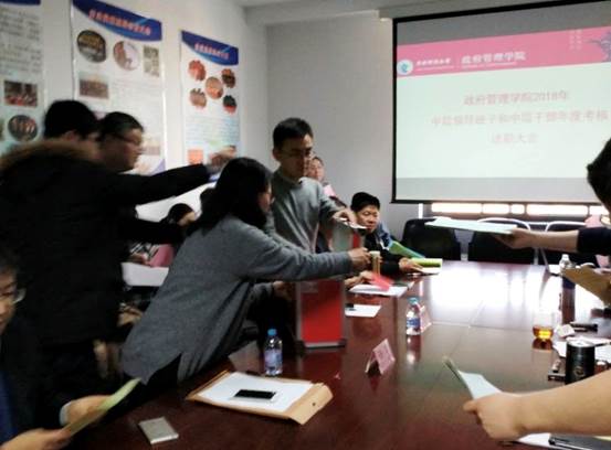 述职完毕后,学校办公室尹玉副主任、许雄刚老师主持民主测评会议,学院教职工、学生代表填写民主测评表。