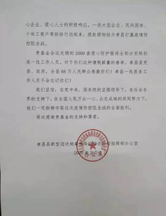 来自孝昌县防控指挥部的感谢信