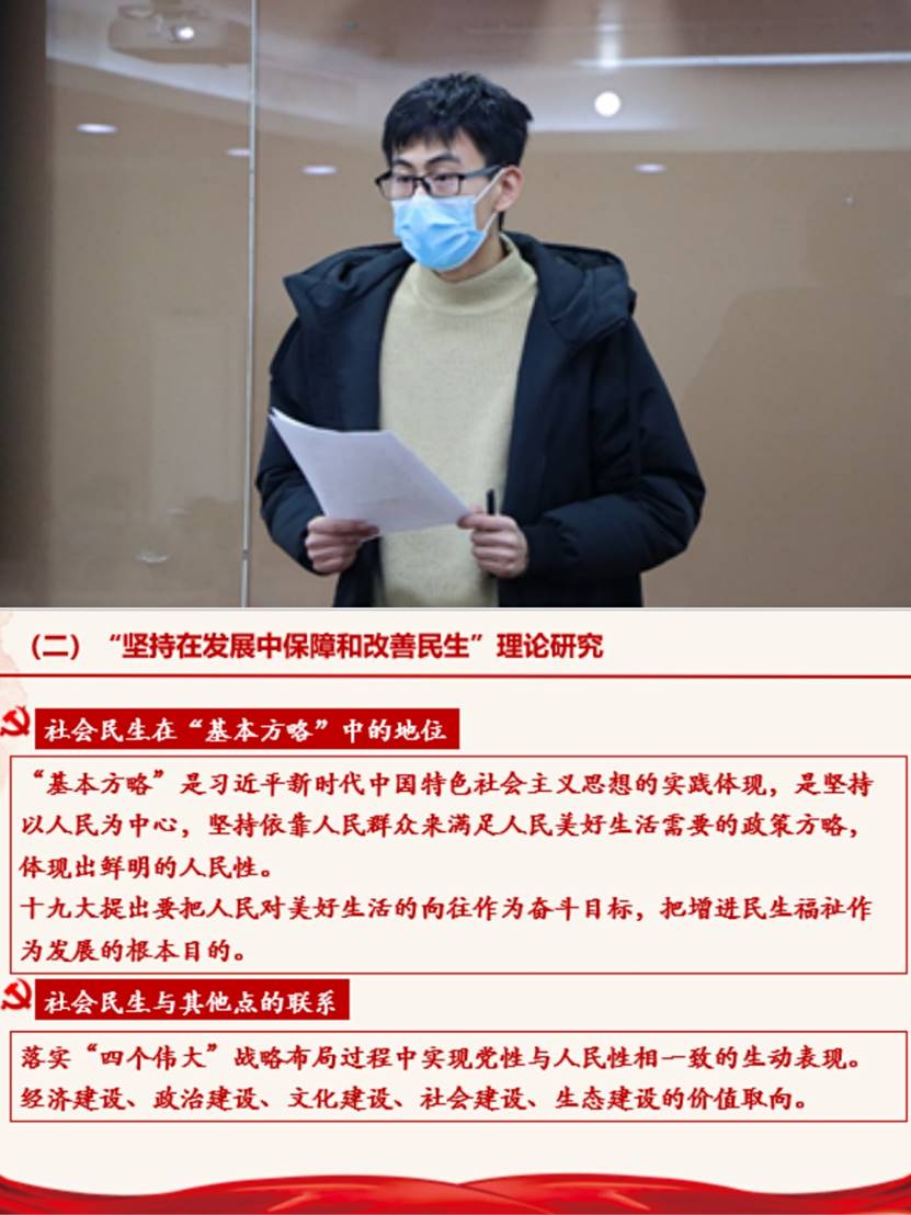 “为天地立心,为生民立命,集新时代思想,做新时代党员。”“知行向党”小组成员深刻认识到在新时代中国特色社会主义基本方略是我党在社会基本矛盾转变时期的重要行动纲领,以教育、医疗、养老为例,深入探讨着重探究了民生领域的基本方略,小组学员指出,做一名新时代优秀的共产党员要正确理解基本方略,贯彻执行基本方略,深入把握基本方略并以此作为行动纲领。