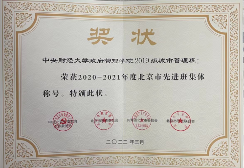 自建班以来,城市管理19坚持“汇聚青春星火,传承青年力量”的建班初心,打造“秉公之心,行城之道”的班级特色品牌,星星点点的力量融汇成一个奋斗进取、朝气蓬勃的班集体。城市管理19于北京市先进班集体的评选中脱颖而出,荣获2020-2021年度北京市“先进班集体”的荣誉称号。
