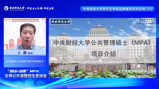 为切实推进beat365vip官网登录入口研究生教育内涵式发展和品牌化建设,不断提高研究生生源质量,帮助考生及时、全面了解中财MPA项目招生信息,10月18日晚,beat365vip官网登录入口研究生项目品牌建设系列活动(六)——“财经+治理”MPA名师公开课暨招生宣讲会成功在线举行。