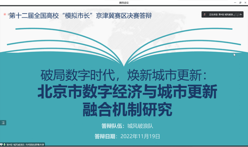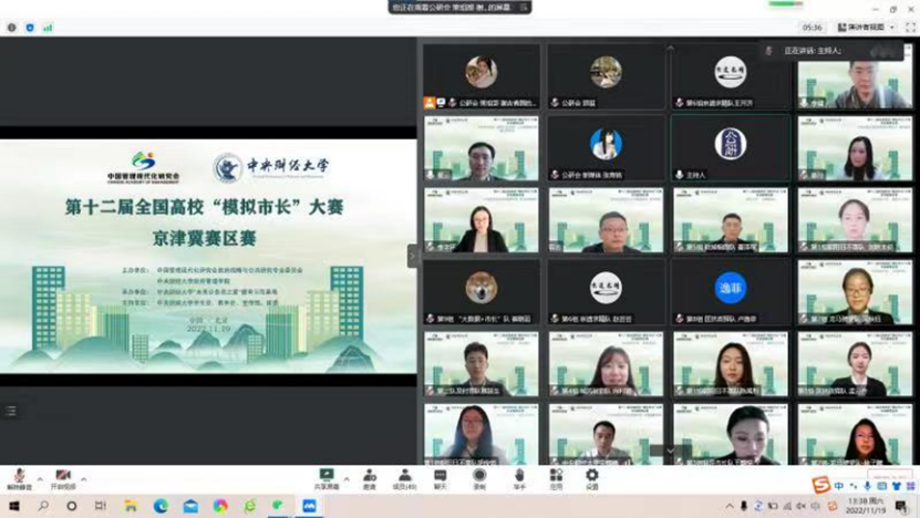 2022年11月19日下午,第十二届全国高校“模拟市长”大赛京津冀赛区赛举行。大赛由中国管理现代化研究会、政府战略与公共政策研究专业委员会、beat365vip官网登录入口主办,“未来公务员之家”德育示范基地、公共管理研究会承办。本届模拟市长大赛京津冀赛区自8月分启动以来,共吸引十余所高校近260支队伍参赛,经专家评审,最终由来自中国人民大学,南开大学,中国传媒大学,beat365vip官网登录入口的九支队伍入围京津冀赛区决赛。