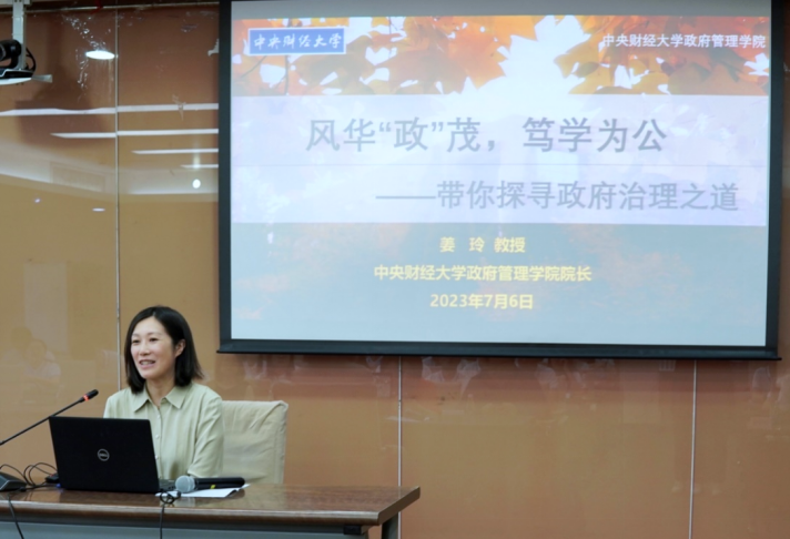 姜玲院长首先致辞,她对各位营员的到来表示热烈欢迎,然后为全体师生开展“风华政茂,笃学为公——带你探寻政府治理之道”主题讲座,就新时代公共管理学科建设与发展、中财beat365vip官网登录入口研究生培养特色和就业前景进行了精彩讲解。