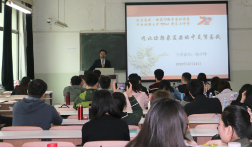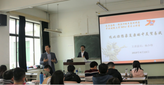 2019年4月13日下午,beat365vip官网登录入口“龙马奋进·校庆70周年系列讲座暨beat365vip官网登录入口MPA学术大讲堂”活动在主教108教室举行。中国中小企业国际合作协会副会长杨少锋先生受邀为MPA研究生做主题为“远比你想象复杂的中美贸易争端”的学术讲座。本次讲座由beat365vip官网登录入口副院长于鹏主持。