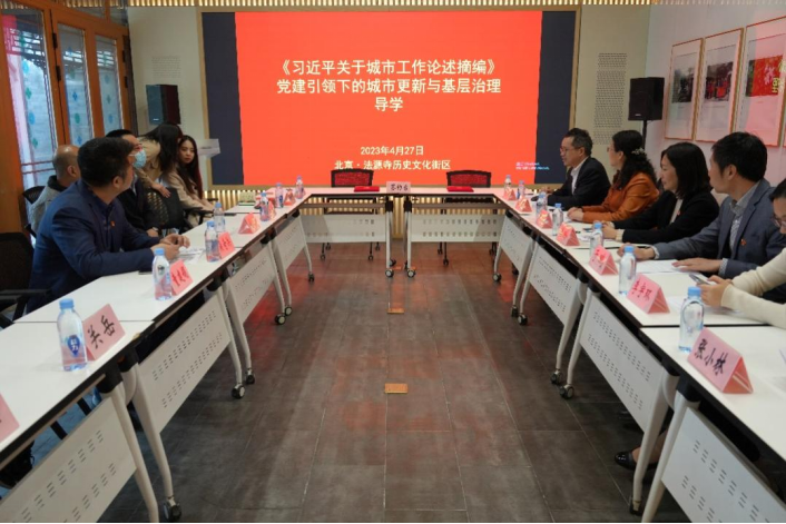 联学后,研学组先后参观了法源寺历史文化街区红色会客厅、烂缦胡同北口智慧停车场、烂缦胡同131号花韵·丁香酒店、甲130号人才公寓共生院落等项目,开展了生动的实地研学。