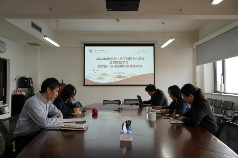 2023年2月16日,beat365vip官网登录入口党委在1407会议室召开2022年度党员中层干部民主生活会会前专题学习暨理论中心组专题学习。会议由学院党委书记于鹏主持,院长姜玲、副院长李宇环、组织员张小燕参加学习。